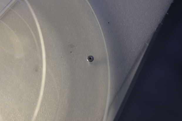 Poner los remaches en los agujeros y utilizar una remachadora para conectar los discos de cuatro del fondo y la espiral. Apriete firmemente pero tenga cuidado de no romper el plexi.