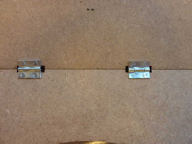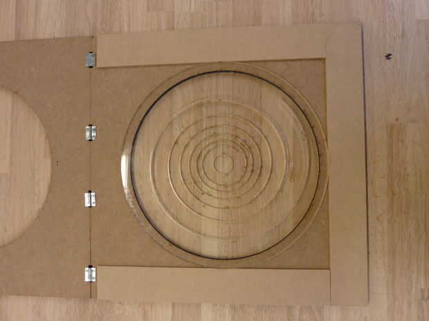 -Pegar la placa de aluminio con el gran círculo cortado en la parte inferior del mecanismo de fijación con pegamento epoxi. Antes de hacer esto, asegúrese de que los tornillos de las bisagras queden al ras con el MDF. También es una buena idea de lijar ligeramente la superficie de aluminio y MDF antes de pegar para que tenga una buena adherencia.