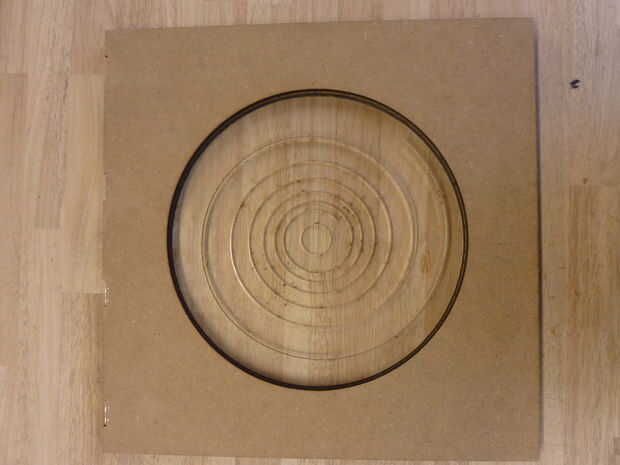 -Encolar las tiras MDF en lugar así que usted tiene el Círculo circunscrito y la espiral de plexiglás encaja perfectamente en ella. Asegúrese de que el Círculo circunscrito es concéntrico con el círculo que se lasercutted de la placa superior e inferior.