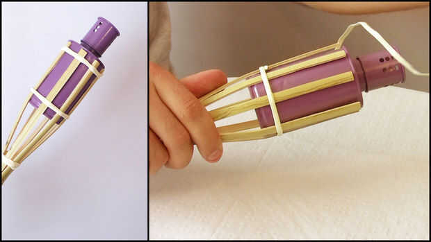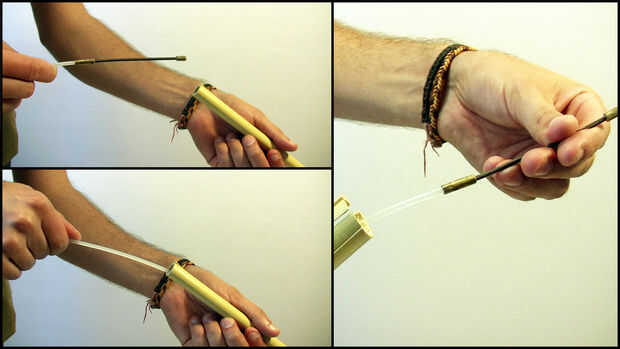 Después de cortar uno de los extremos del palo, me alimenta un extractor de alambre en el palo y conectado el cable al ser halado.