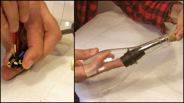Me perforó un agujero en un tapón y resbaló en el cable, seguido de una toma de la botella y foco de luz.