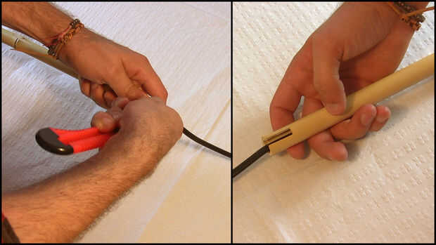 Entonces, me di cuenta que tengo que cortar el espacio para el cable. Lo debería haber hecho antes de tirar el cable a través del palillo, no gran cosa. El bambú es fácil de cortar.