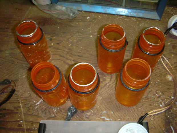 Poner juntas de goma alrededor de las boquillas de botella por lo que se encuentra firmemente cuando los casquillos se atornillan en. Gire la botella a través de los agujeros y tornillo de las tapas de desde el otro lado, teniendo cuidado de no los alambres, gire el tornillo girando la botella, no la tapa.