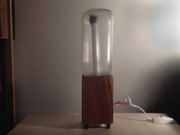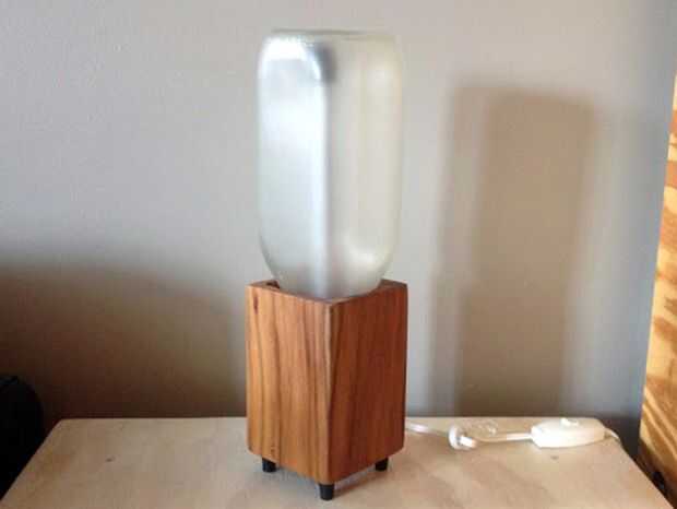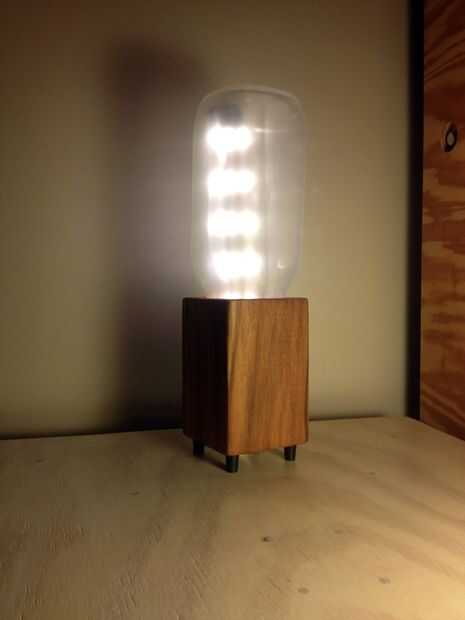 Combiné dos botellas de cuarto de galón con unas tiras de LED de Ledberg de IKEA y unos pedazos de poste de la cerca para hacer un par de lámparas de lectura. Flanqueando el sofá, son simples pilares moderno de día y luces suaves y atmosféricas por la noche. Utilizando sobre todo el material rescatado, cuestan aproximadamente $20 cada uno y tomó alrededor de 8 horas para armar.