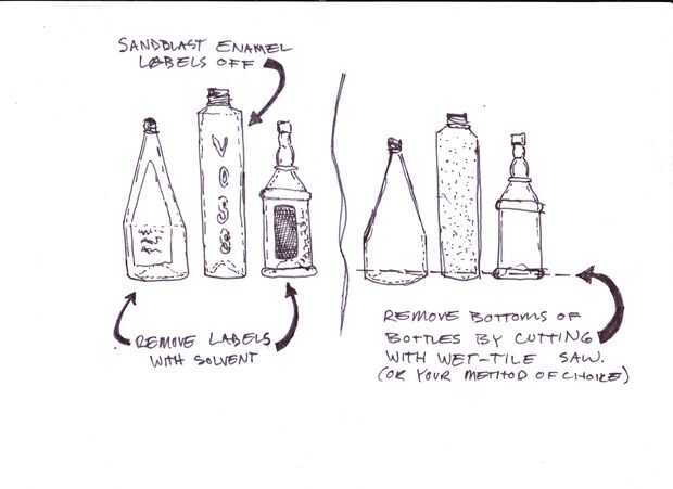 Lo principal que las botellas que han hecho es tener sus fondos quitados. Sin la eliminación de los fondos, sería imposible montar la lámpara y nunca sería capaz de encajar una bombilla dentro. Usaba una sierra mojada para cortar los fondos de mis botellas, pero también puede usar la puntuación + método de choque térmico para cortar el vidrio. Después de separar los fondos, solía un router con una broca de diamante de la arena de cualquier borde filoso.