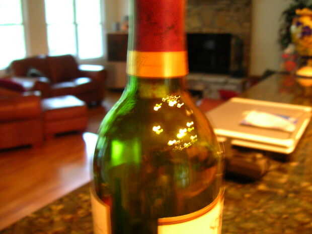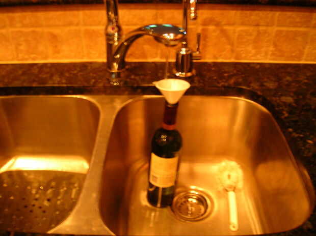 Bueno, he decidido que no quería perder un montón de aceite de la lámpara al llenar la botella de vino. Así que pensé, "Hey! Aceite flota en el agua, derecho?" Ves donde va.