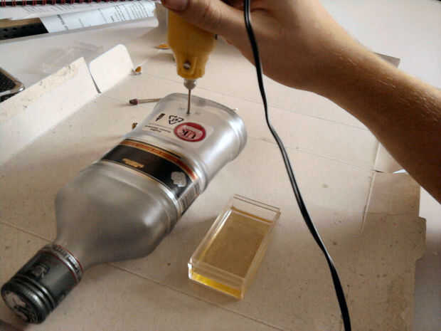 Como se puede ver, estoy usando aceite para facilitar la perforación. Esto es opcional le da un acabado más agradable y ayuda a que el vidrio cortado un poco más seguro pero hace el proceso un poco más lento. Para taladrar el agujero debe ser paciente y no poner demasiada presión sobre el vidrio. Es una buena idea empezar con una herramienta que tiene un extremo puntiagudo para progresar a través del vidrio y luego pasemos a las herramientas de más amplia para ensanchar el agujero. Me tomó unos 45 minutos para perforar a través de todo el camino y hacer el agujero agradable y limpia. Herramientas de fresa de diamante se utilizan para el grabado pero pueden funcionar bien para taladrar vidrio hogar. Herramientas de carburo de silicio funcionan también, pero en ninguna parte cerca como fresas de diamante.