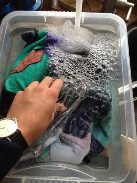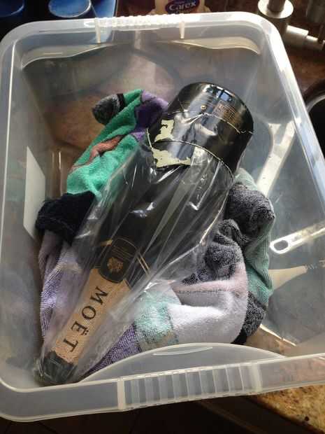 Coloque una toalla vieja en el fondo del recipiente y utilizarla para dejar la botella de balanceo, con la parte posterior de la botella mirando hacia arriba se llenan de agua a la tapa a la botella.