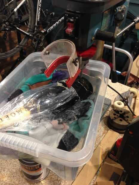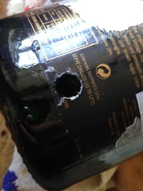 SEGURIDAD: perforación de vidrio obviamente tiene algunos peligros, el vidrio es agudo y si se rompe podría cortar así que consideres usar guantes. También puede ser una buena idea para proteger sus ojos sin embargo por perforación submarina te minimiza el riesgo de algo volando. En esta etapa también mantenga la contraetiqueta, tenderá a mantener cualquier astillas de vidrio.