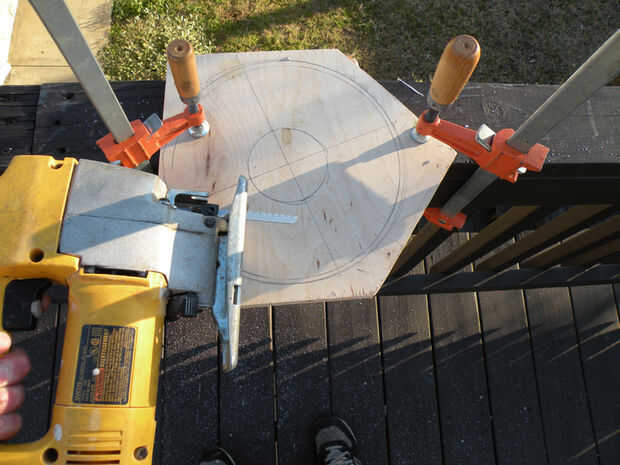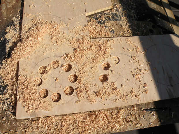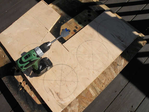 En dos de los círculos, poner ocho puntos de centro en un patrón radial. Empezar tirando una línea a través del círculo, dividiéndolo en dos; luego se mide el centro de la línea. Una plaza y tire una línea perpendicular a la primera, dividiendo el círculo en cuatro partes iguales. Subdividir, como cortar un pastel, para crear piezas incluso ocho. Medir cada línea 2-1/2" desde el centro y haga una marca. Perforar cada marca con una broca de 1-1/2". Hacer dos piezas idénticas como esta. En uno de ellos, perfore el centro con el 2-1/4" agujero Sierra poco.