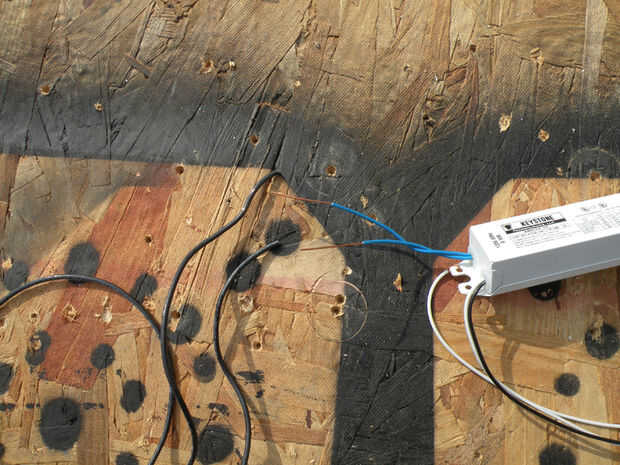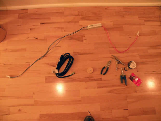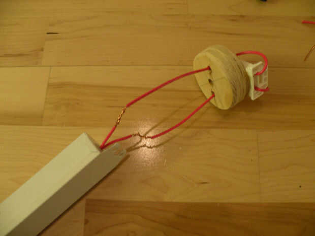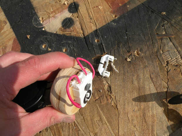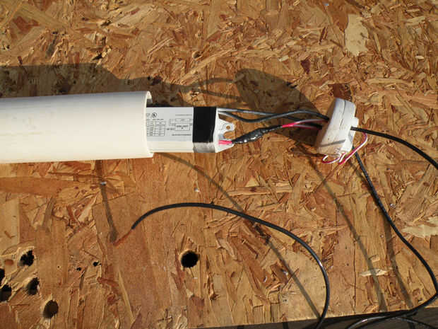 Envuelva todo para arriba apretado y prueba el bulbo para asegurarse de que el cableado es correcto. Cinta los cables al lastre para hacer un paquete compacto. Cosas el lastre y los cables en el tubo, luego empuje el enchufe después. Debe encajar muy bien; Si no va, poner las manijas de unos alicates en la madera y golpear la cabeza de las pinzas con un martillo. Asegúrelo con un tornillo o dos.