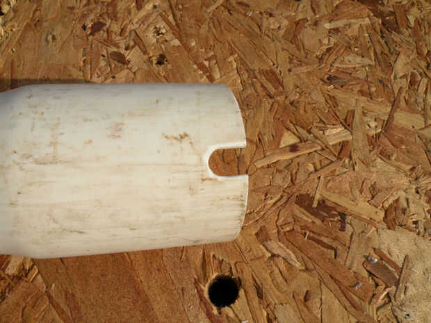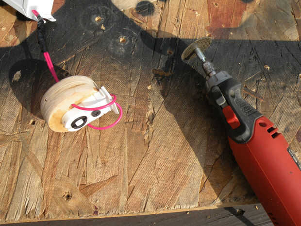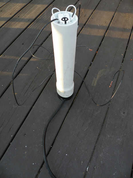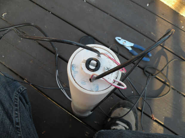 Corte una ranura pequeña en la base de la tubería con una Dremel para el cable de alimentación a la salida. Con cinta adhesiva alrededor del boquete para que concreto no se escaparán para arriba en el tubo.