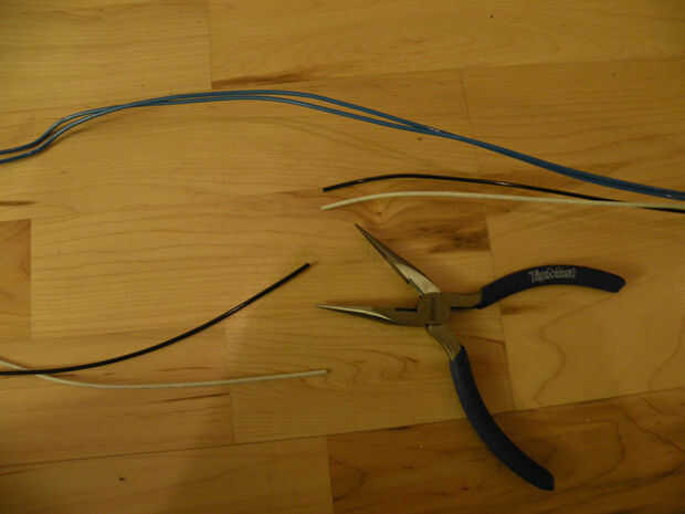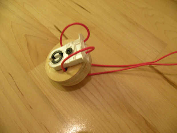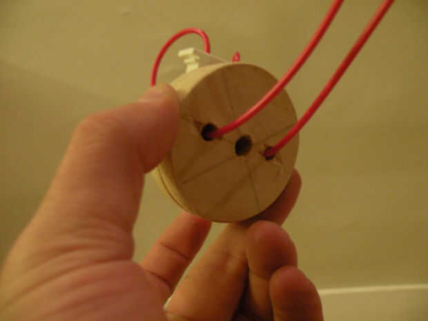 Cortar la otra toma y volver a cablear los dos lidera con cerca de cuatro pies de cable de altavoz negro o similar. Pase los cables por los agujeros del cable en la clavija de madera. Peque cinta adhesiva y pintar el enchufe blanco si así lo desean.