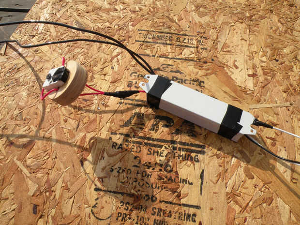 Tomar el tapón creado por aserrado agujero el encofrado y arena hacia abajo hasta que puede caber dentro de la tubería de PVC. Cortar los cables que van desde el lastre a un extremo de la lámpara y el tornillo que la luminaria a la clavija de madera. Haga dos orificios en la madera para pasar los alambres a través. Vuelva a colocar el zócalo para el lastre conduce con unos tres o cuatro pulgadas de alambre entre ellos. Los cables de cinta.