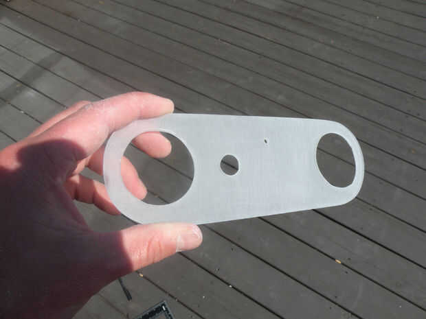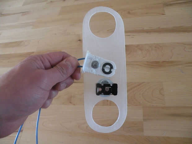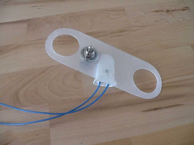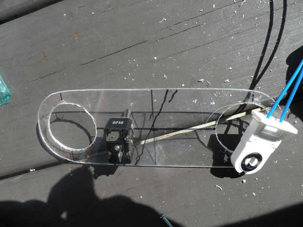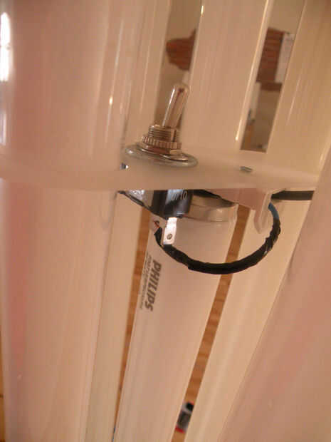 Usé un 1/4" pieza de plexiglás, chatarra que la ferretería me deja gratis. Cortar un rectángulo aprox. 2-1/4 "x 6"; Mantenga por encima de las tapas de los tubos y escriba dos tubos opuestos sobre la misma. Taladro ésos hacia fuera (¡ con cuidado!) con la broca de 1-1/2". Perfore otro agujero pequeño para montar el zócalo con una máquina y un cuarto para el interruptor. Asegúrese que el interruptor esté lo suficientemente lejos de la toma que no interferirá con la bombilla.