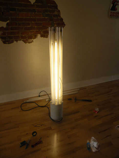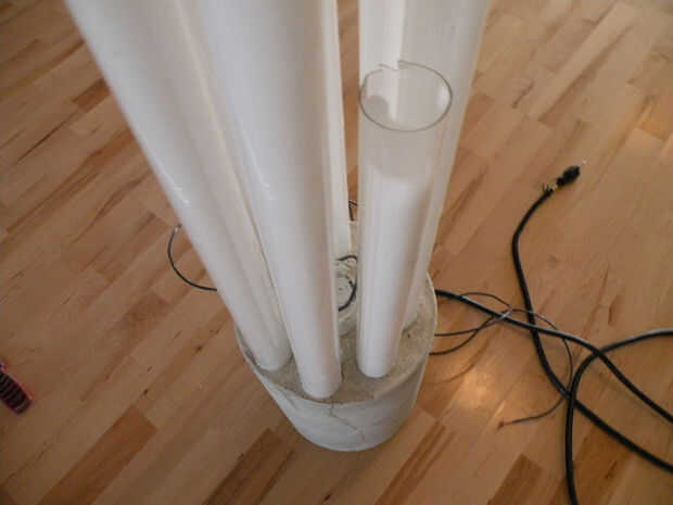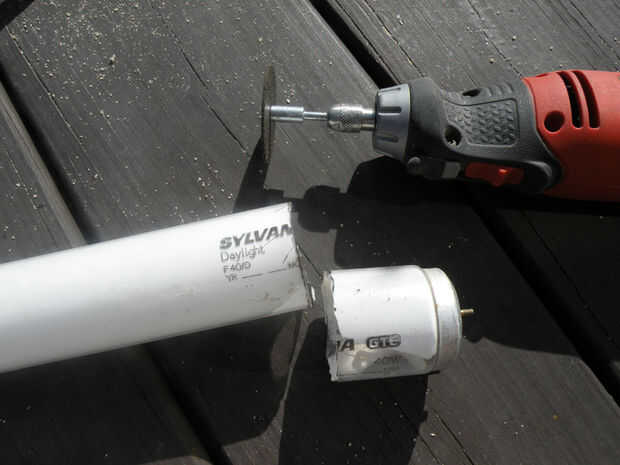 Nota sobre tubos rotos: Si tiene un tubo roto, grieta hacia fuera cristal, limpiar la toma resultante en el concreto con una Dremel (usar una protección ocular y mascarilla), luego pegar un tubo nuevo en. El nuevo tubo será demasiado largo, ya que será imposible conseguir la base enterrada de la bombilla de la toma. Utilizar una Dremel para cortar cuidadosamente un poco del tubo de reemplazo para conseguir las alturas a la línea de arriba.