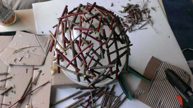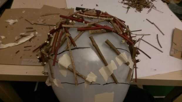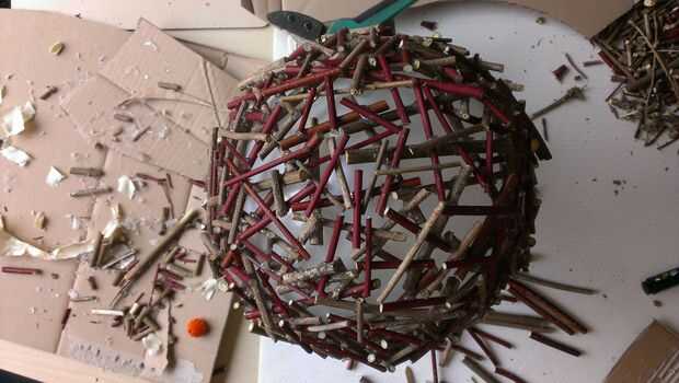Una vez que ramas son parte de la malla, puede quitar la cinta adhesiva que está sosteniendo el balón. Hacer esto mientras que no todas las ramas se unen es más fácil, ya que hay todavía algo de espacio. Seguir añadiendo ramas hasta que la esfera es la forma deseada.