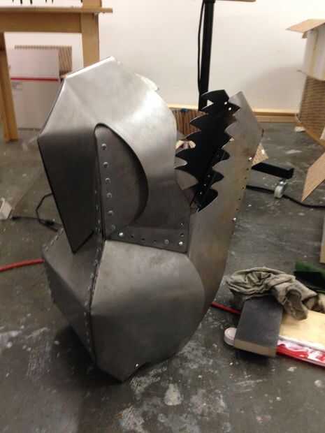 Una vez que el diseño de los patrones convertida a dibujo del CAD que es legible en Rhino .fold líneas están marcadas con líneas discontinuas pero deben retirarse cuando importar a Rhino. la ruta para el cortador del plasma debe ser una línea continua. después se corta el patrón Marque la línea de doblez con marcador, me aseguré de cuando pliegue hay es tolerancia para el espesor. calibre 16 se considera grueso pero todavía se puede doblar con fuerza. Tuve que amarrarla en vicio para doblar las líneas rectas. No utilizo martillo o snip lata en esta etapa. el patrón se limpia y lija para eliminar los residuos. porque el acero no es inoxidable, formé todo en un fin de semana. De lo contrario aerosol lubricante para evitar oxidación. los agujeros son taladrados con broca de mayor tamaño para facilitar el montaje.