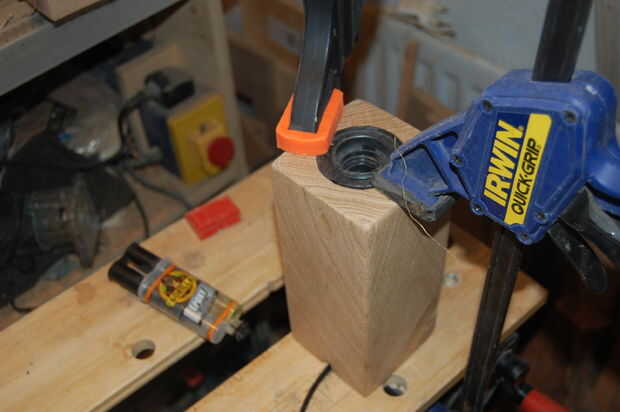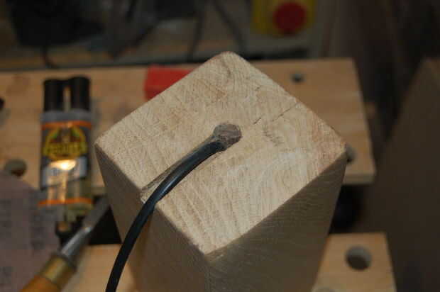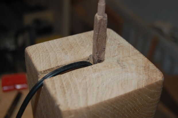 También he añadido una cuña de madera de nogal con el agujero en la parte inferior para que el alambre no accidentalmente tiró demasiado difícil decir si la lámpara nunca consiguió golpeada fuera de la mesa. Ya tenía un poco pequeño de nuez del tamaño adecuado así que creó una forma de cuña hasta el final con mi cincel y presionó en la cuña bastante hasta que se paró. Marcó el final, quitaron, picados a tamaño y volver a la base.