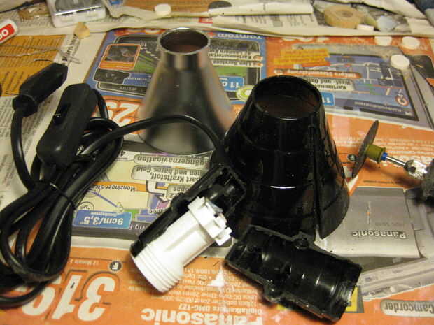 Primero si has comprado una lámpara deberás tomarla aparte. Asegúrese de desconectar! Una forma muy fácil de tomar aparte es utilizando un disco de corte de Dremel SpeedClic plástico y corte a lo largo de la cara (Use anteojos de seguridad!), como se muestra en la imagen. Si no tienes una Dremel, también puede utilizar pinzas.