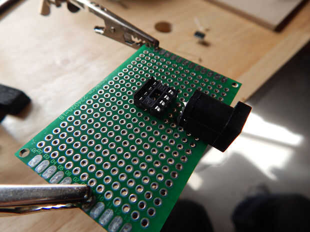 b) ahora se enchufe el conector. Si quieres, ponerlo directamente con el conector de barril para limpieza. Una vez que termines solo soldadura en.