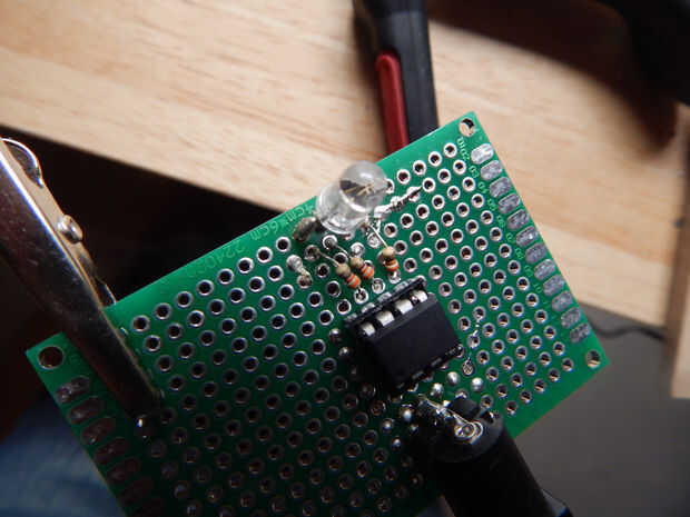 c) por último, soldar el cable rojo a su resistencia y su resistencia a su pin en la IC. Lo mismo para el verde y azul. Foto 2