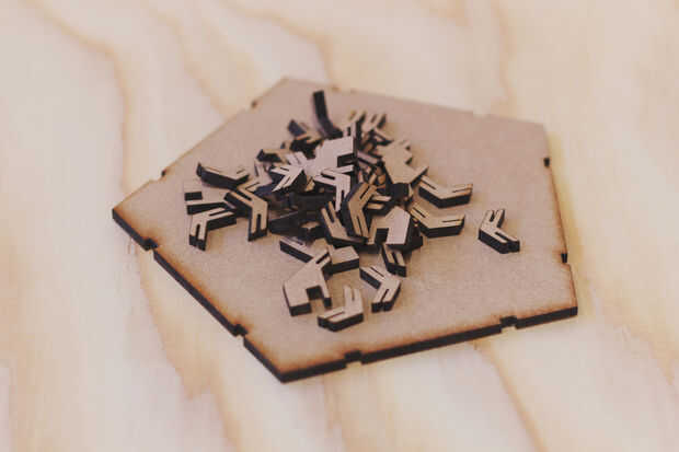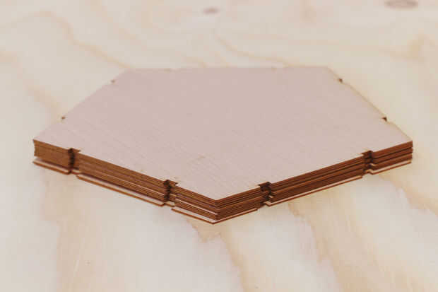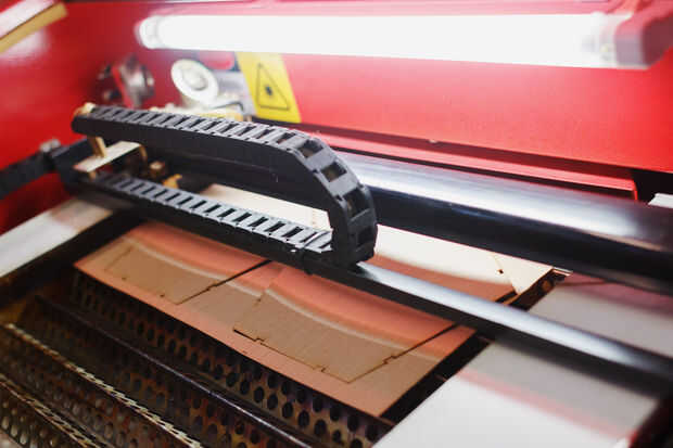 Un Consejo para el manejo de la chapa de madera. A menudo no es plana y puede dar un tiempo difícil para el rayo láser a foco, o bien usted puede doblar en la dirección opuesta (que puede resultar en romperla) justo antes de ponerlo hacia abajo en la cama láser, o puede utilizar algunas pesas de metal para presionar hacia abajo. arandelas de metal más pesadas tienden a trabajar bien. También ayuda a utilizar como hojas pequeñas como sea posible.