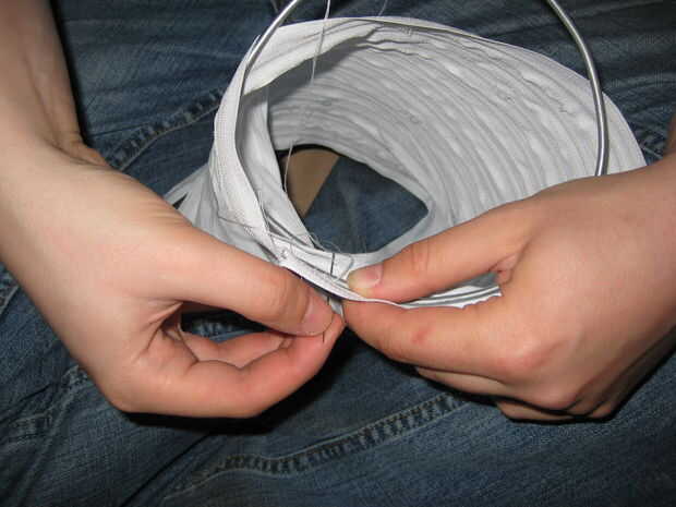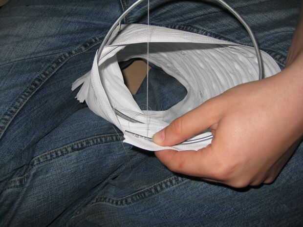Mano coser este es el lugar en un extremo del tubo, teniendo el cable siga la costura entre las cremalleras.