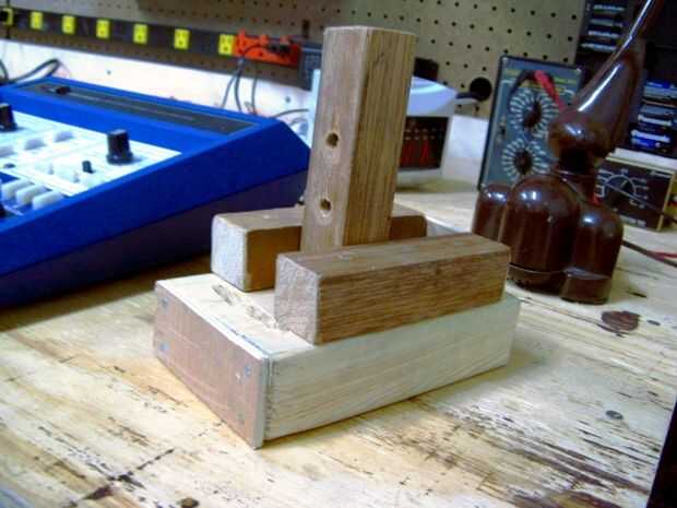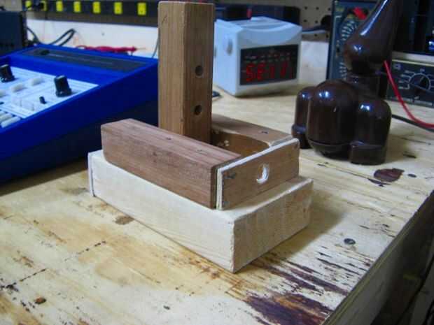 Esta es la base que construí para sostener los componentes (antes de la tinción). He hecho completamente de madera. Específicamente, una pieza de 2 x 4 sobra desde la construcción de mi banco de trabajo, un pequeño trozo de madera contrachapada y algunas vieja es que en un momento solía levantar de mi cama.