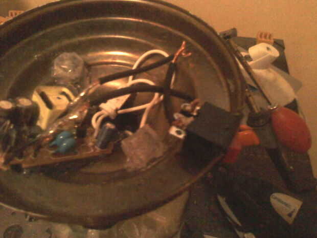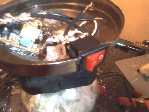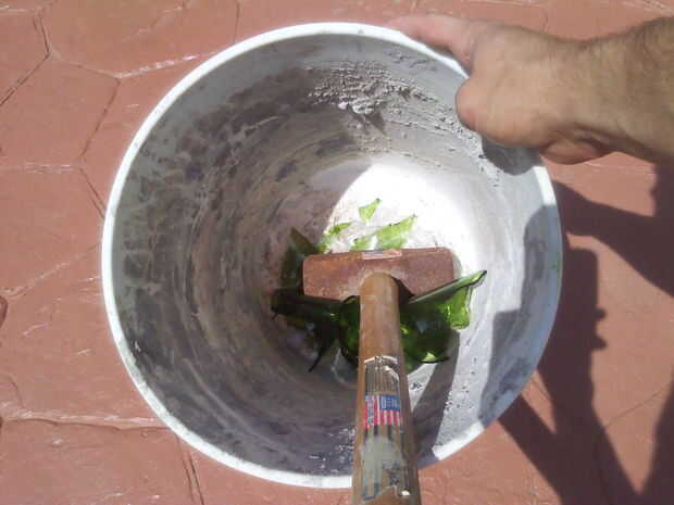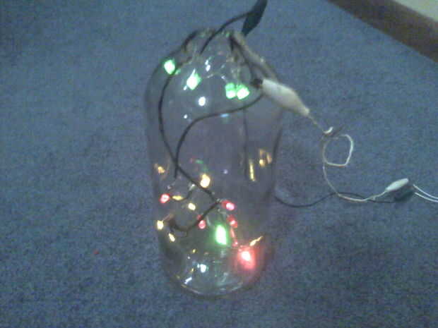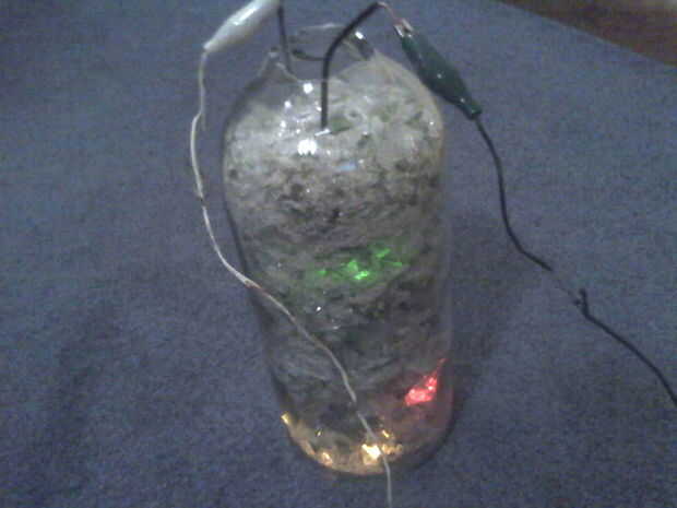 El proceso de hacer esto fue simple, pero bastante lentos. Algunos LEDs se aparearon con un adaptador de pared de 9 voltios para ser la fuente de luz. Después de que los LEDs se sueldan juntos y funcional, rompieron algunas botellas de cerveza y el vino para obtener el vidrio roto (reciclaje, yay!). Se corta el cuello de una botella de cristal usando una herramienta giratoria Dremel y un disco de corte, y algo de luz golpeando con un mazo de goma fue suficiente para romper el vidrio a lo largo de la partitura. Los LED se coloca en la botella y rotos vidrio añadido. El agujero en la parte superior de la botella de vino fue sellado con una combinación de capas de cinta aislante y pegamento caliente. Una base de tubo de PVC o una pieza de metal rescatada fue agregada a la casa el adaptador de 9 voltios y para montar un interruptor en.