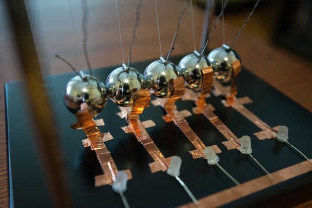 fascinante. Fascinantes.  Puede mirar en él durante horas.  Juega con él todo lo que quieras.  Este dispositivo demuestra la conservación de la energía y el ímpetu.  Cuando usted hacer pivotar una bola golpea a otra, transferirá a la energía de una b