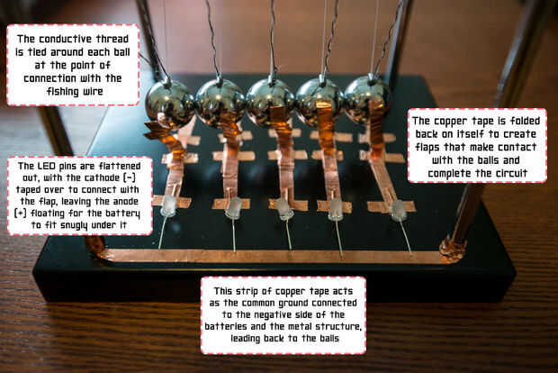 Primero, doblar la cinta de cobre sobre sí mismo para hacer las aletas debajo de las bolas que hacen contacto cuando están en sus posiciones fijas. A partir de ahí, la cinta del lado del cátodo (negativo) del LED a la aleta, con el lado positivo hacia la dirección opuesta. Por debajo de los ánodos (positivos), una tira de ir de cualquier lado del soporte como se muestra la cinta. Las baterías se encajen entre los ánodos y esta tira.