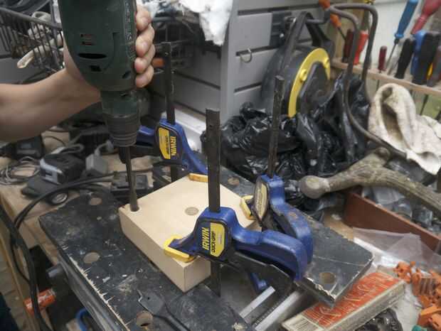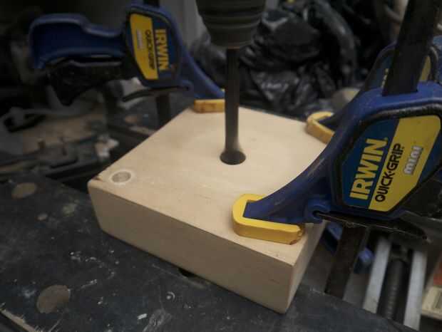 Encontré este bloque de jelutong pre corte y no tengo el equipo para que sea más delgado, aunque lo haría si pudiera. Así que había queda con la forma y lija en la parte superior y los lados del bloque. En el centro se taladró un agujero de 19mm para el vástago y en la esquina que se taladró un orificio de 13mm para el botón perforar este agujero 1 cm para ambos lados.