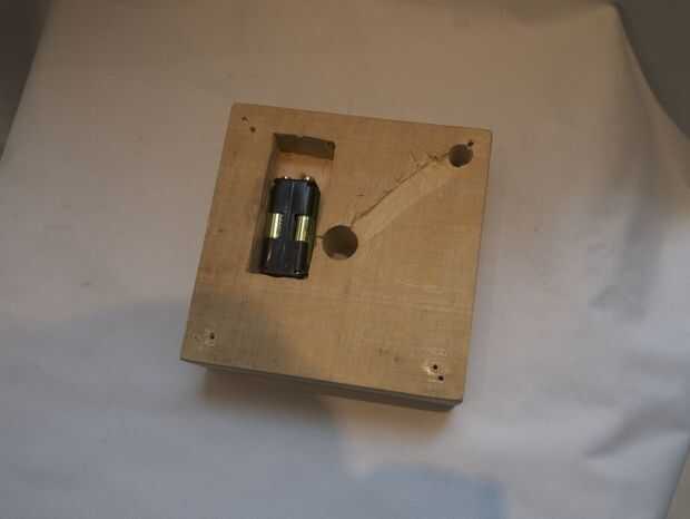 En la parte inferior cincelado un espacio para los cables que van desde el interruptor hasta el tallo y un espacio para la batería. Luego corté un trozo de acrílico negro para enroscar en la parte inferior. Tiene forma de esta manera por lo que puede girar a cambiar las pilas por lo que es importante poner la rebanada en forma de pieza sobre la batería.
