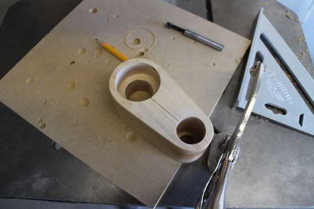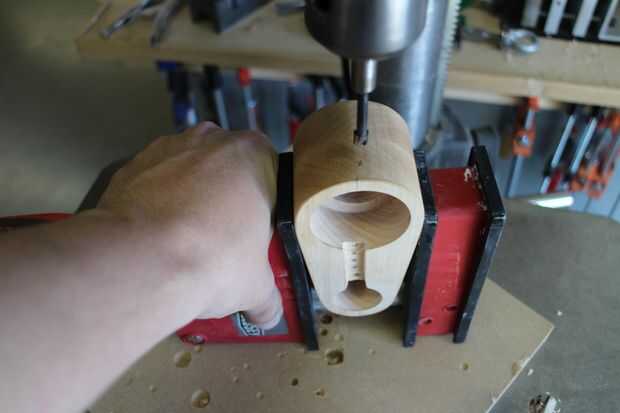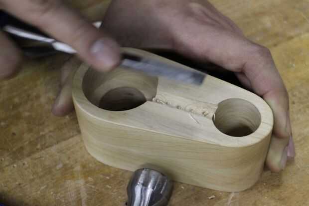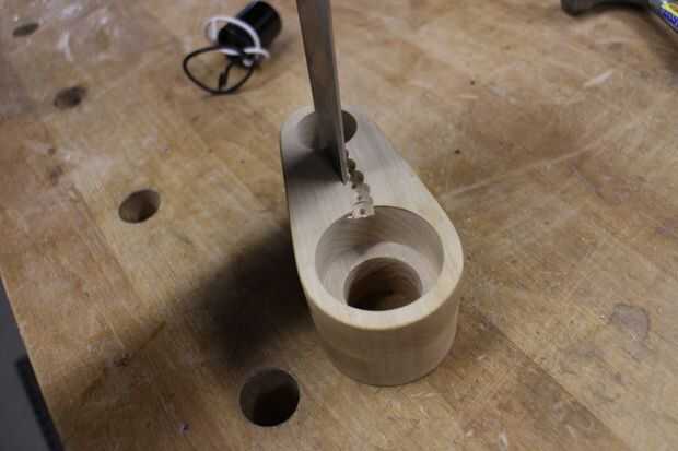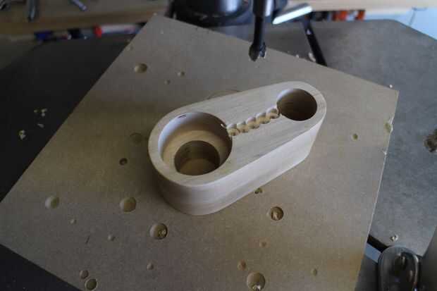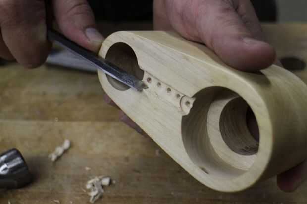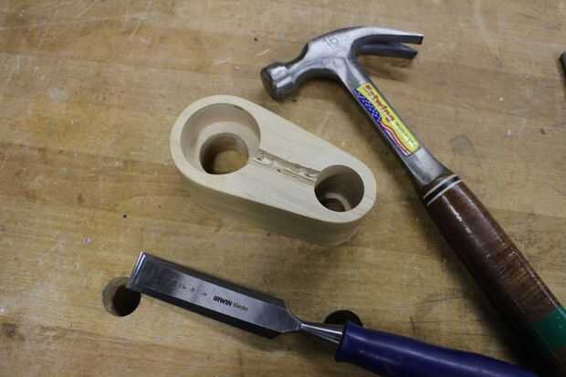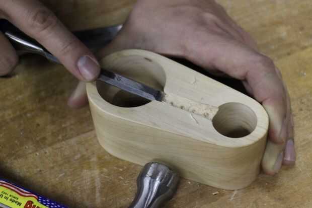 Para hacer el canal, acabo de había marcado una línea entre el orificio y perforados de 1/4" de profundidad con una broca de 1/4" Ø forstner. Con los agujeros perforados, usé cinceles para limpiar el canal.