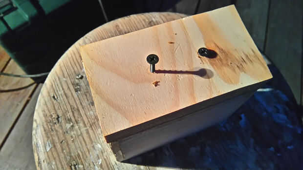 recubrir completamente el cuadro. Que perforar agujeros de los tornillos para evitar que la madera de la división. Entonces yo montar cada pieza en una caja excepto la parte superior. Que perforar un agujero en el lado de la caja y otro en el centro de la parte superior para pasar el cable.
