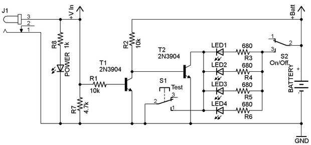 Apretando el botón de prueba botón S1 se encenderá el LED sólo cuando hay una tensión en J1 y el interruptor S2 es el. Esto mostrará que la unidad está activa.