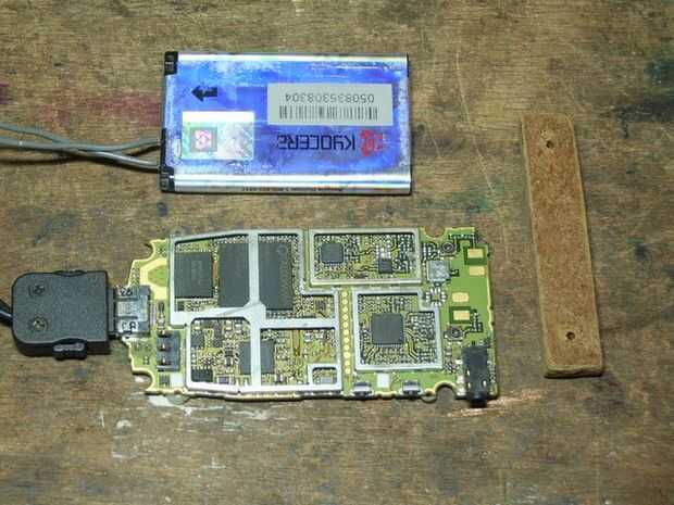 2. se trataba de un viejo teléfono flip de Kyocera circa 2005. Había desmontado el teléfono hasta el tablero pelado. La única parte que va a utilizar es el cargador de baterías de Li-ion a bordo.
