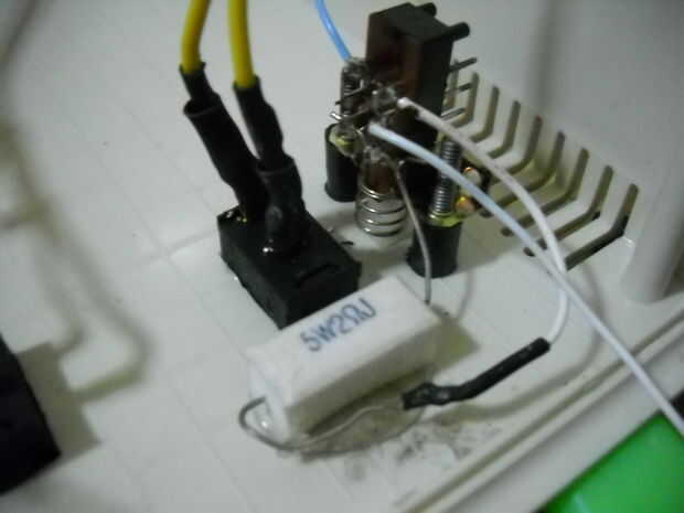 (+) Terminal de salida de la alarma va a la terminal del centro del interruptor SPST. Conecté un 2 Ohm, resistencia de 5W en una terminal y conectado su extremo al otro terminal w/c se conecta directamente a las tomas de la bombilla. Esto se convierte en actual función de límite apaga las luces y ahorrar batería. 2 ohmios no es mucho pero hay un efecto de atenuación sensible.