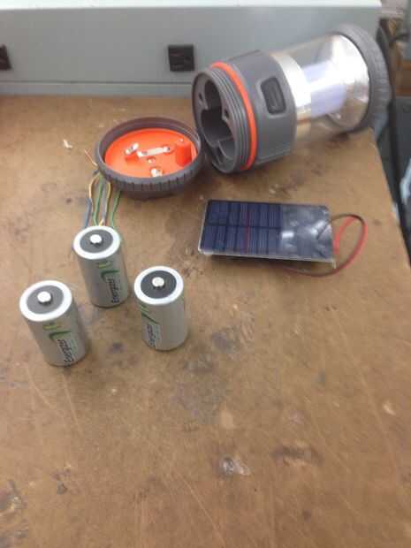 Hice un reloj de un registro, alimentado por un panel solar y una batería recargable.Lo que necesitarás:un registro deuna pequeña célula solar y conexiones de la batería (compré una lámpara jardín accionada solar barata, y quité la célula solar y con