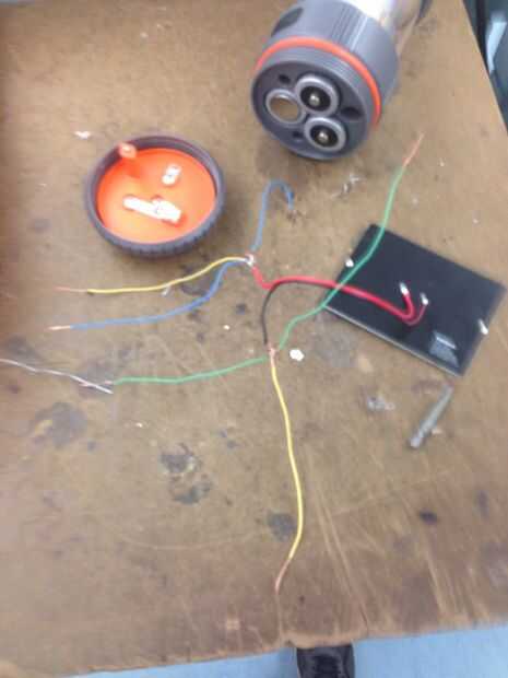 Soldar 3 cables a cada cable del panel solar. La soldadura 2 de los cables positivo a los extremos negativos de la caja de la batería. En la foto de arriba, es los dos círculos de metal bajos en la parte naranja separada. Luego de la soldadura de uno de los cables negativos al el extremo positivo de la carcaza de la batería. En la foto de arriba, es el círculo elevado en la parte separada. Conecte los cables negativos restantes a los extremos positivos de las dos baterías y el último cable positivo en el extremo negativo. Por último (en mi caso), os adjunto un cable de conexión de la pieza naranja elevada en la pieza separada para el guión de la lámpara principal. Si has hecho todo correctamente, debe tener una lámpara que puede cargar durante el día y luego ser funcional durante la noche. Si nada más, que funciona cuando es brillante y soleado.