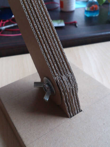 Así que este es el paso difícil... En primer lugar, el doblar el cuadro inferior. No montarlo, hacer los pliegues por lo que sería más fácil completar más adelante. Usted tiene que hacer la parte inferior de capas conjunto poniendo el piezas en forma de T a través del agujero, alineando las piezas, luego conectarlos con un perno. Después de eso, agregar poco de pegamento en la parte inferior de la pieza en forma de T y las alas de la caja y dóblela en forma. Poner unas monedas o chatarra en la caja para evitar que la lámpara se vuelque y luego cerrarla.