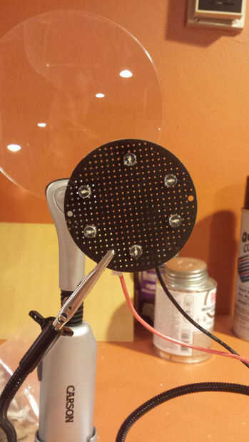 * Nota: probablemente quieres pintar el tablero del PWB en este momento, antes de poner los LEDs, así usted no tiene que preocuparse de conseguir pintura en el LED o encontrar una forma de cubrir por lo que se puede pintar todo lo demás excepto los LEDs. También se recomienda para pintar la botella ahora, por la misma razón, LEDs no realmente iluminar bien cubierto en pintura. También se sugiere hacer unos abrigos en la botella, porque si pierdes un punto es muy sensible cuando los leds y brillar a través de él.