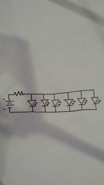 Este circuito es bastante simple, es 6 LEDs conectados en paralelo y una resistencia de echado allí. Ahora va estar mirando los LEDS. Redacté el circuito en una de las imágenes. Básicamente todo lo que quieres hacer es conectar todos los ánodos (positivo de la pierna, pierna más) de los LEDs y luego conecte todos los cátodos (piernas negativas, patas más cortas). Luego conecte un cable de los ánodos y un cable a los cátodos (un cable independiente que a través de la estructura de la lámpara).
