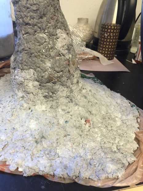Una vez que tengas el formulario de añadir la pulpa de papel y deje que se seque. Una vez seco, gire y tire hacia afuera de la malla, añadir tubo y sellar la parte inferior con más pulpa alrededor de la tubería por lo que es seguro.