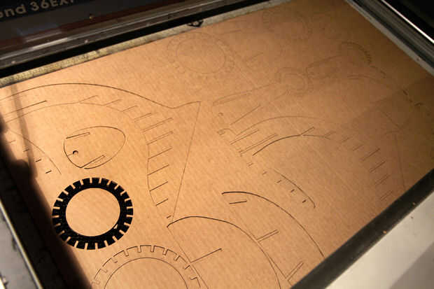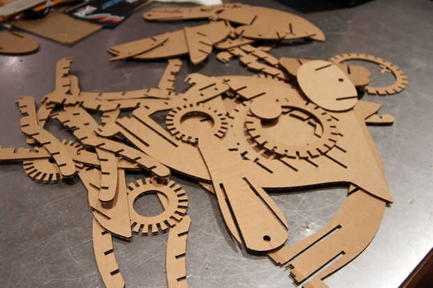 Haber exportado mi proyecto Make 123D como una serie de archivos de vectores EPS, realizó una visita a mi viejo amigo el cortador del laser. Después de unos breves bromas de mí y una extendida queja de él, el cortador del laserme regaló un montón de pedazos de cartulina numeradas.