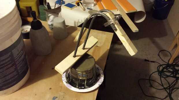 Entonces hice una plantilla de taladrar dos agujeros en una pieza de desecho para mantener la barra en posición. Llené el formulario con hormigón e inserta la varilla después de que el concreto era lo suficientemente firme para mantener en su lugar, teniendo cuidado de mantener la barra fuera de los bordes. Luego utiliza mi lijadora vibratoria para vibrar el hormigón y había terminado de la parte superior.
