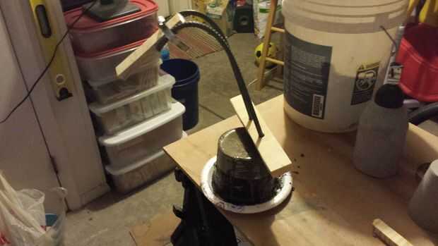 Para la base he utilizado un recipiente de Country Crock. Cortar nuestro fondo y pegado a la tapa cerrada. Doblado doble "L" s en la varilla en la base y doble "J" s en la parte superior para conectar la luz. Usé un tornillo de banco grande y doblada al mismo tiempo para mantener el mismo ángulo.