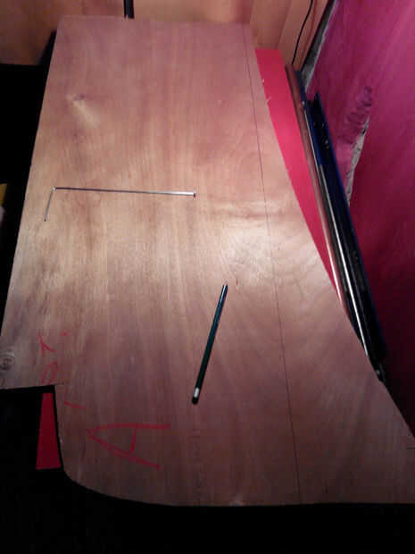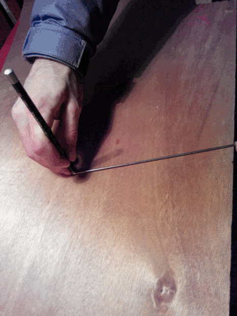 Necesitarás un trozo rectangular de madera contrachapada con cada lado 45cm. Si tiene las dimensiones exactas entonces saltar al párrafo siguiente. Mi problema era dónde colocar el centro para poder montar el disco más grande porque había cortar algunas piezas de la madera contrachapada. El gif muestra exactamente cómo encontrar el centro en una pieza de contrachapado. Necesita un pensil y un repuesto (marcado en 21cm).