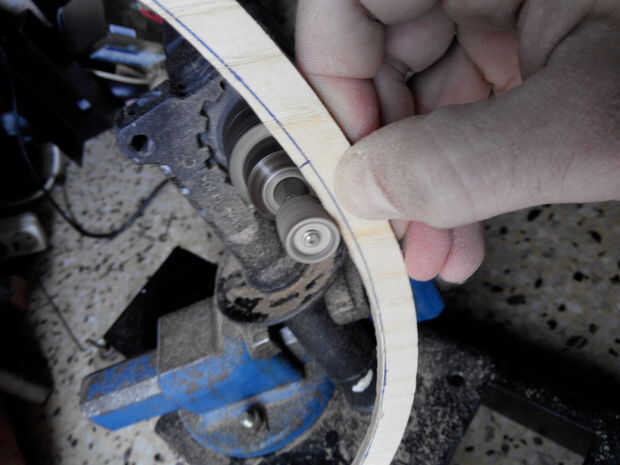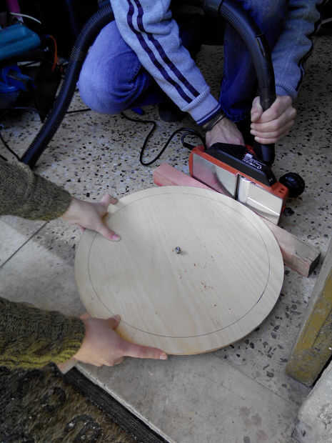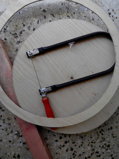Si wan ' t mi método es cómo cortar los discos. Después de marcar por los círculos en la madera contrachapada vas a necesitar dos piezas de madera que te ayude plase la madera y el cepillo eléctrico. El procedimiento va como esta. Lugar el centro de la casi redonda de madera contrachapada de ejecutado en el tornillo de señalar y luego con el cepillo completamente alrededor de la perimemeter externa del disco girando la madera contrachapada. A continuación use Sierra de la joyería para cortar el perímetro interno del primer disco. Luego mueva el pedazo restante de la madera contrachapada más cerca a la cepilladora para seguir alisando el perímetro exterior del segundo disco y así sucesivamente. El procedimiento también se puede ver en las fotos.